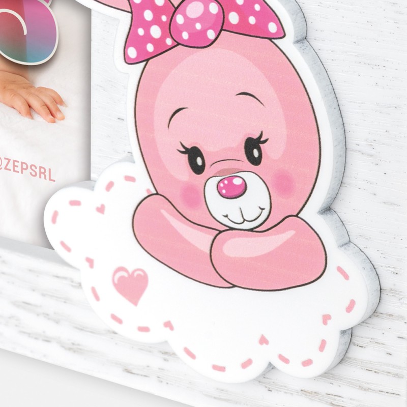 Dječji okvir bijele boje sa rozim detaljima.